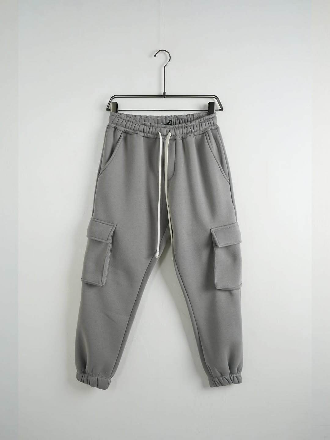 Featuring an elastic waistband with adjustable drawstring and elasticated cuffs, these pants provide a secure and comfortable fit. The cargo-style side pockets add practicality and a clean utility look, making them ideal for casual outings, lounging, or everyday activities.