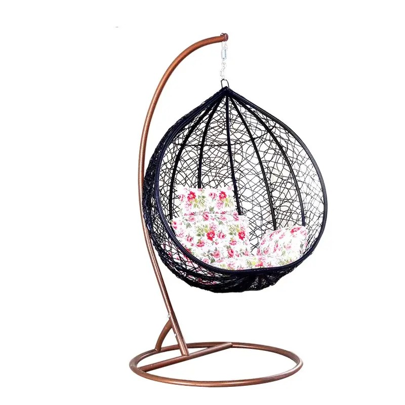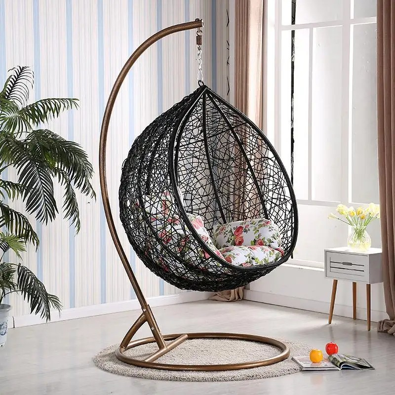 Stylish hanging egg swing chair with a strong metal stand and woven basket design. Includes soft cushions for comfort and is perfect for indoor or outdoor use in living rooms, balconies, patios, and gardens.